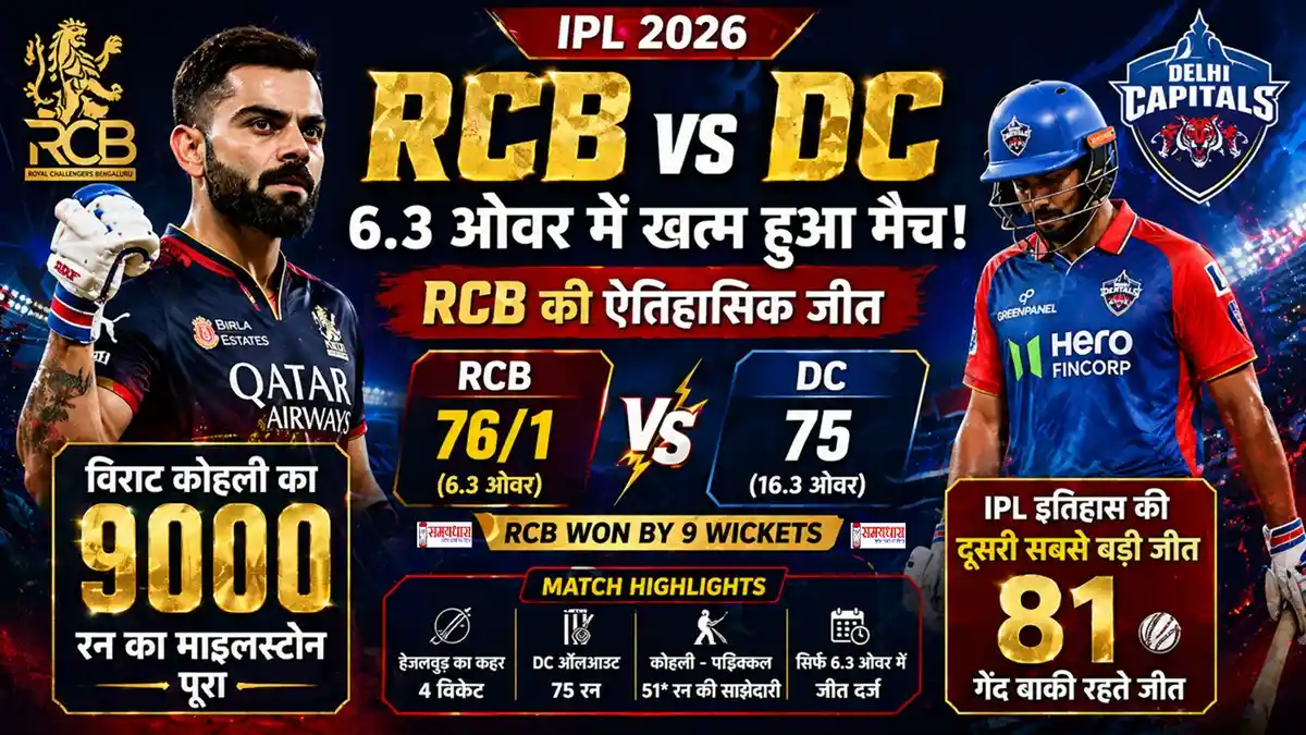 RCB vs DC IPL2026 Highlights Delhi Capitals के खिलाफ खेले गए इस मैच में आरसीबी ने सिर्फ 6.3 ओवर में लक्ष्य हासिल कर 9 विकेट से जीत दर्ज की।